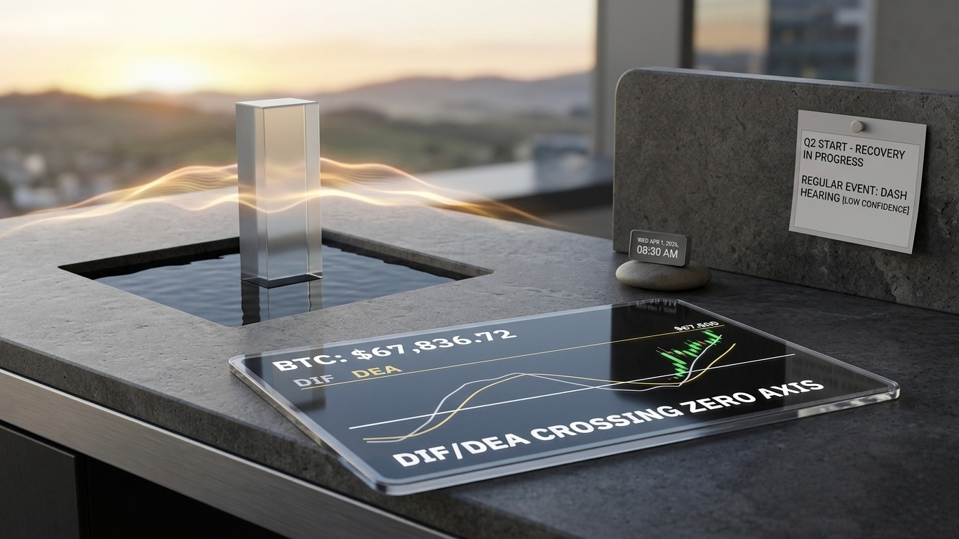 早安。 市场在 Q1 的最后时刻完成了一次技术性“收绿”,BTC 和 ETH 均成功站稳了关键结构位。正如 10:00 截图所示,BTC 现报 $67,836.72,在 Q2 的第一个交易日,多头正尝试利用DIF/DEA 的零轴上方金叉这一强势信号,冲击 $68,500 压力位。