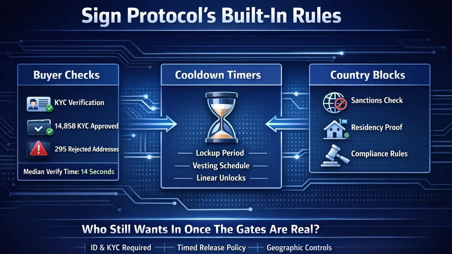 SIGN’s docs frame Sign Protocol as the evidence layer, while TokenTable handles allocation and distribution. So when people talk about cooldowns, buyer checks, and country blocks, they are talking about a rule stack, not a token button. At a crowded bus station, the driver does not argue with every rider.