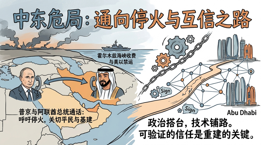 普京和阿联酋总统的通话,谈的是停火,但停火之后呢?霍尔木兹海峡的收费法案不会因为停火就撤销,美以船只被禁的条款不会因为停火就作废。中东的规则正在被重写——谁能在新规则里提供“可验证的信任”,谁就是下一波浪潮的基建商。