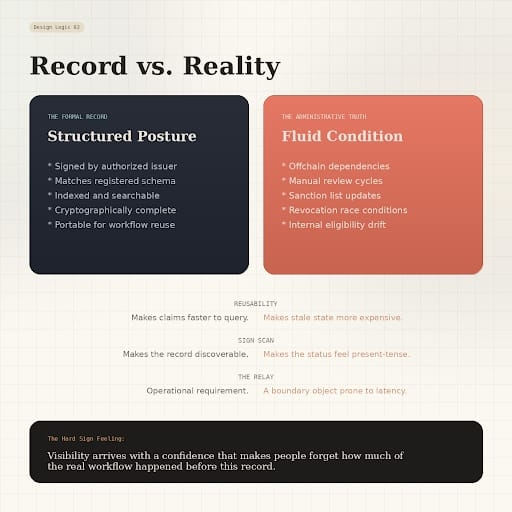 I keep coming back to one ugly little example. Review team has a subject that is good to proceed under one narrow path, not final for anything broader. Everyone around the case knows that. It lives in notes, comments, someone’s head, all the healthy institutional places where precision goes to die. Then the schema field gets set to something neat because nobody wants the future record looking half-resolved. Later a claims filter sees the neat field. Later reporting sees it. Later some partner sees it. Great. By then the team can even tell themselves the later misuse was the real mistake.