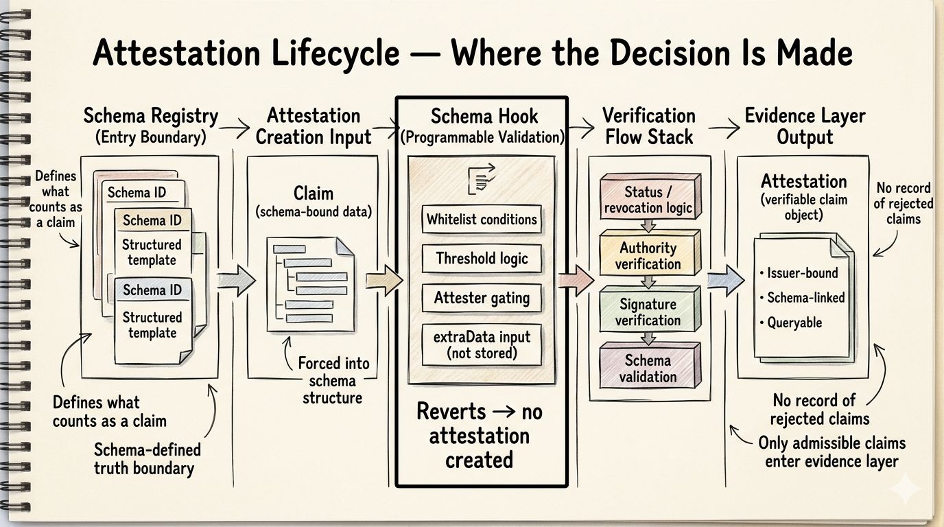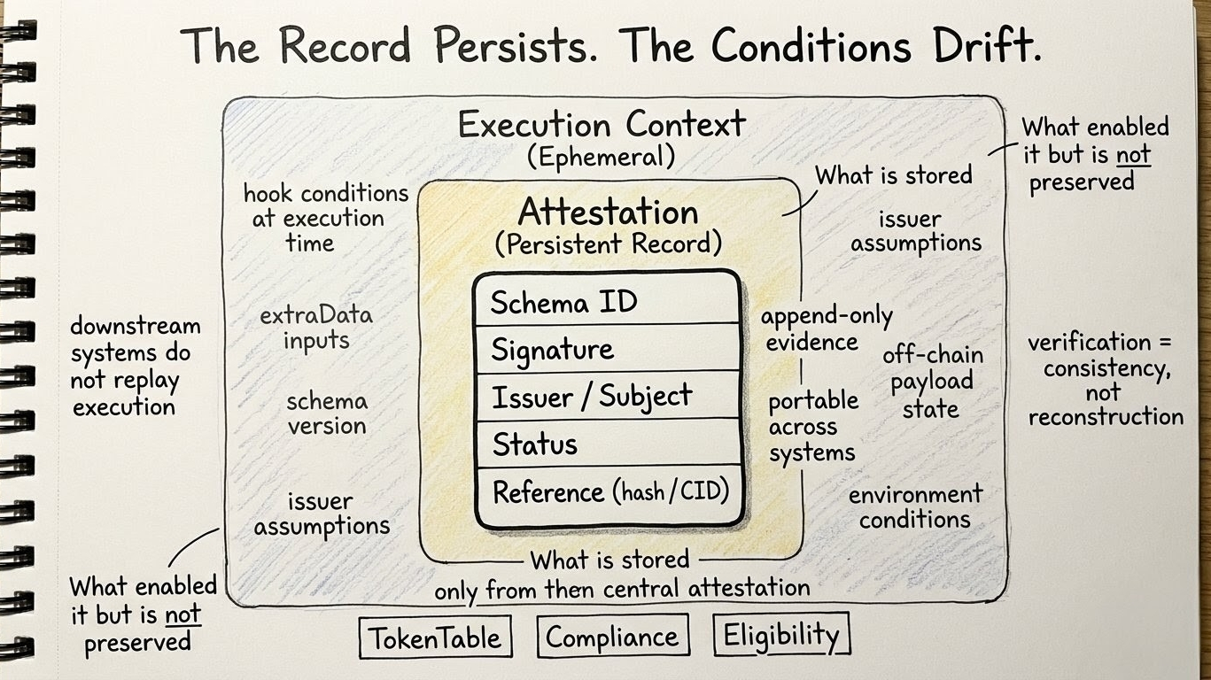 TokenTable and other Sign-powered application layers keep consuming that emitted attestation state under schema. what stays visible after that is emitted attestation state. what doesn’t stay equally visible is the issuer-side process, the schema shaping, and the hook-time reasoning that made emission possible.