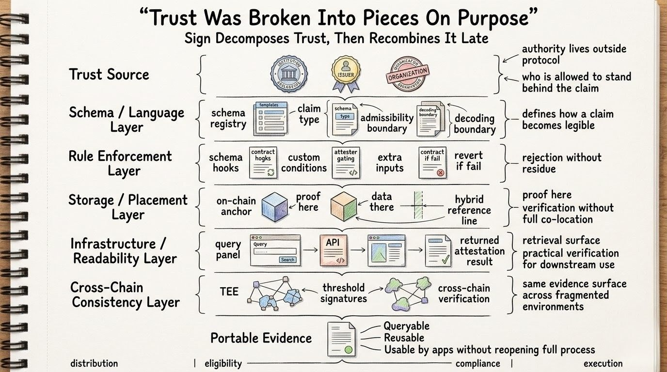 that’s the split inside sign that keeps bothering me. the moment something was decided and the moments where something happens because of it are no longer the same place. they don’t even share the same conditions anymore. one belongs to context, people, timing, the awkward and unstable part. the other belongs to emitted attestation state becoming SignScan-visible, application-readable, and usable under schema.