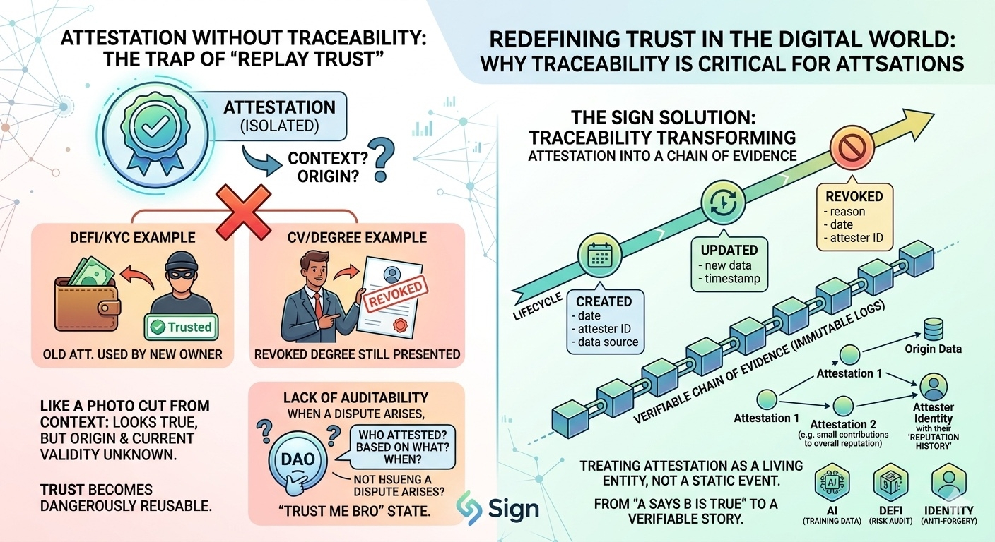 Nếu nhìn rộng hơn, traceability không chỉ là tính năng kỹ thuật, mà là nền tảng để trust có thể được tái sử dụng một cách an toàn. Trong AI, nó giúp truy nguồn dữ liệu training; trong DeFi, nó giúp audit rủi ro; trong identity, nó giúp chống giả mạo. Và chính ở điểm này, mình nghĩ Sign không chỉ lưu trữ attestation mà đang định nghĩa lại cách niềm tin được hình thành, theo dõi và kiểm chứng trong thế giới số.