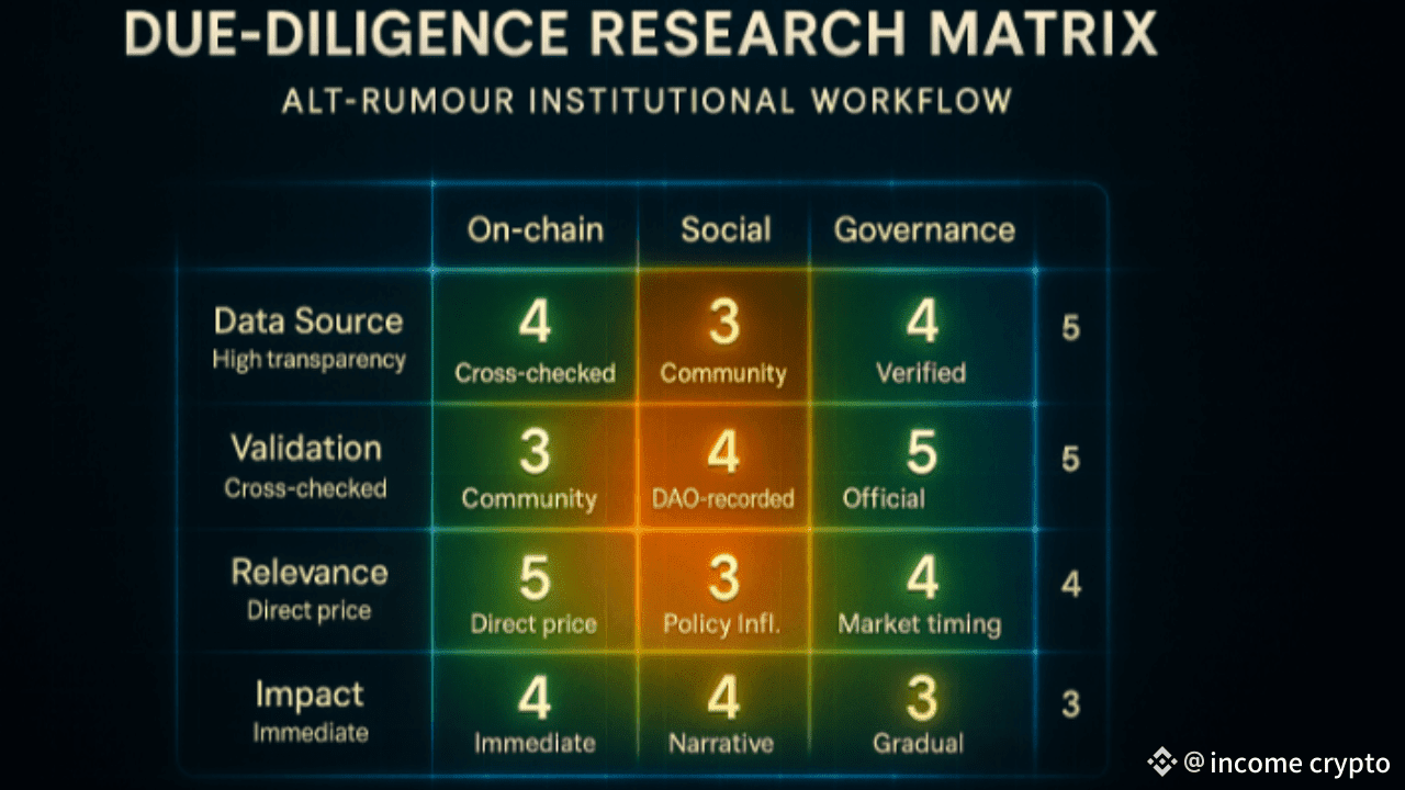 Proprio come un Due-Diligence Checklist esamina ogni dettaglio prima di un grande affare, Alt-Rumour.app fornisce un modo strutturato per le squadre di ricerca istituzionale di verificare la credibilità dei dati. La domanda è se la ricerca intelligente ora possa generare alpha non solo facendo affidamento su numeri, ma anche su segnali di rete e indizi basati sul contesto. Alt-Rumour fornisce una risposta pratica a questa domanda.