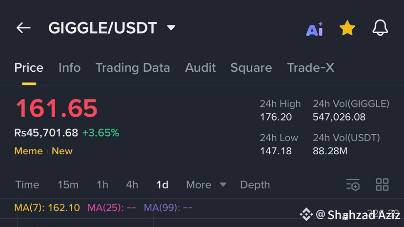 I prezzi rispetto alla valuta locale (ad es., Pakistan PKR) mostrano guadagni molto forti: una fonte mostra 1 GIGGLE ≈ ₨44,827 (~USD 119) e +72 % in 7 giorni.