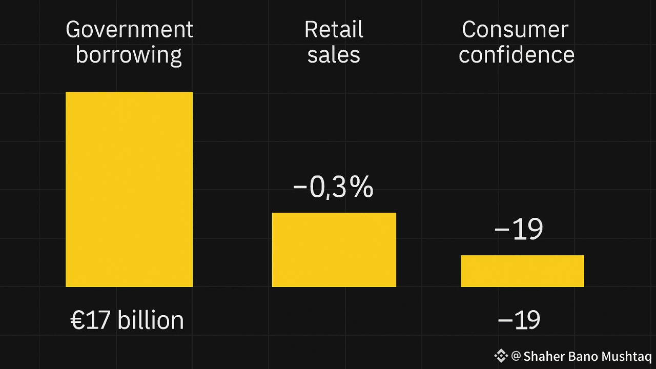 I nuovi dati del Regno Unito mostrano quanto sia difficile la strada in vista del bilancio di mercoledì. Il debito del governo è aumentato ancora, raggiungendo 17 miliardi di sterline il mese scorso, che è 2 miliardi di sterline peggio di quanto previsto dall'OBR. Allo stesso tempo, l'attività sta rallentando, con le vendite al dettaglio che calano per la prima volta da maggio. Questo dimostra che le persone stanno spendendo di meno man mano che la pressione cresce, e i trader sia di azioni che di cripto, in particolare $BTC spectatori, stanno prestando molta attenzione.