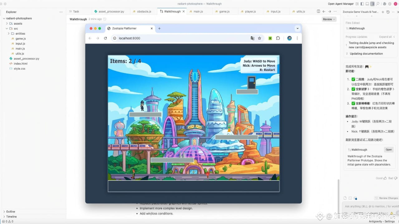 Senza ulteriori indugi, ecco il risultato: generare un gioco a scorrimento orizzontale a tema Zootopia in 5 minuti, comunicando con l'AI in linguaggio naturale e senza scrivere una riga di codice; più dettagliata è la richiesta, maggiore sarà il livello di completamento.