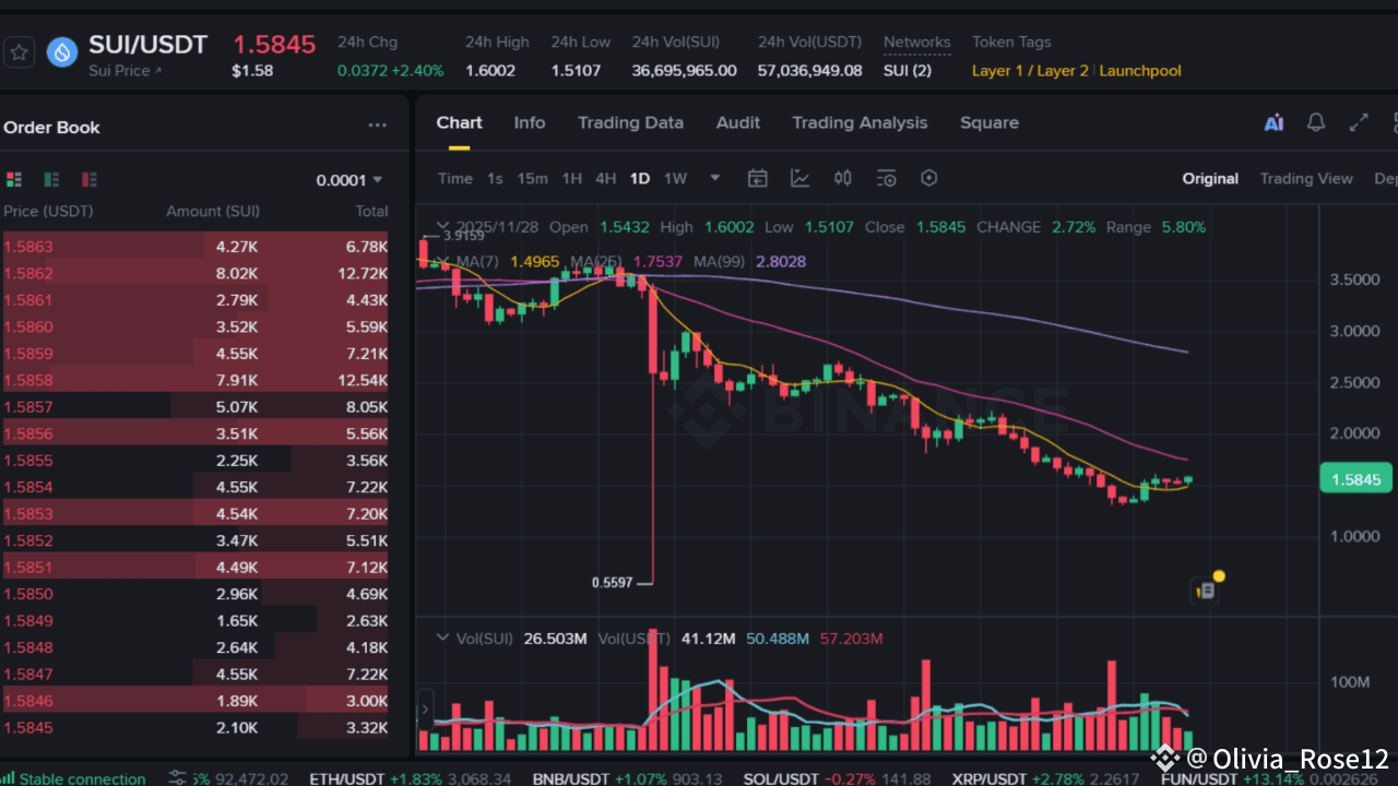 Con SUI attualmente scambiato attorno alla zona $1.58–$1.59, il mercato si trova in un punto di decisione chiave. Un breakout confermato rafforzerebbe la tesi di continuazione rialzista, mentre qualsiasi rifiuto che rimane comunque sopra il supporto mantenerebbe la tendenza costruttiva e favorirebbe un altro slancio verso l'alto.