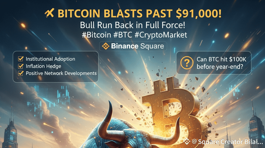 Il breakout di Bitcoin sopra $91.000 segna una pietra miliare importante alimentata dalla fiducia istituzionale e da forti fondamentali di mercato. Che tu stia facendo trading o mantenendo, rimani concentrato sul quadro generale — il momentum del mercato rialzista è appena iniziato. ⚡