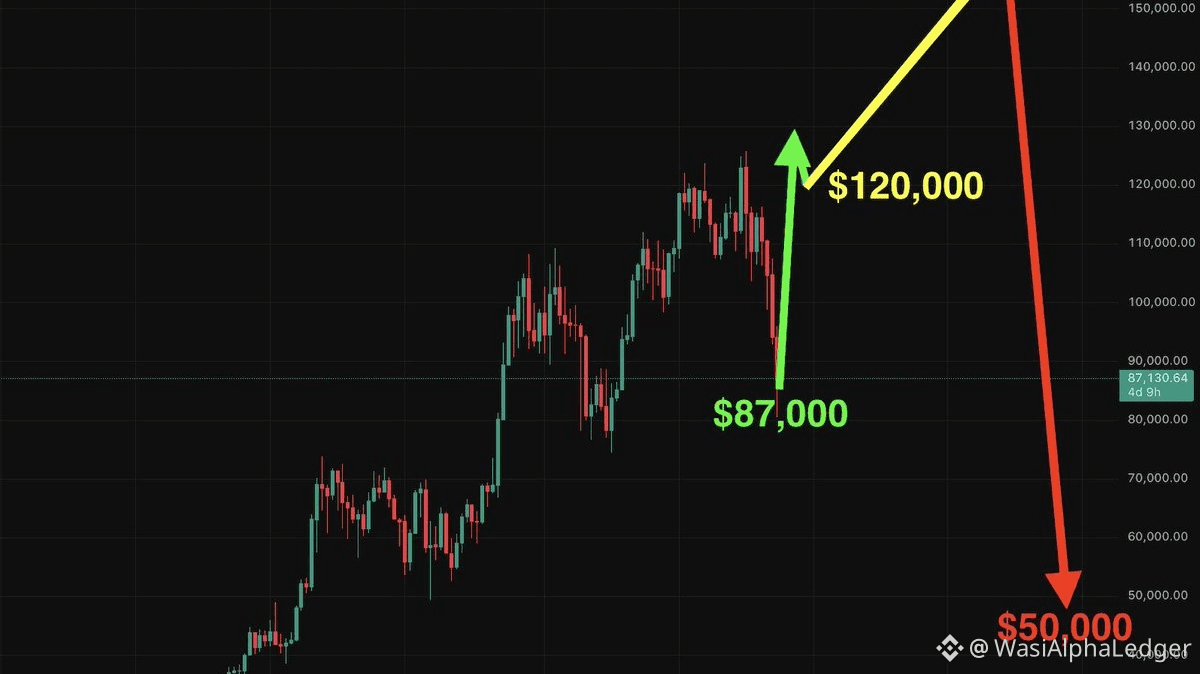#Bitcoin sta lampeggiando un segnale che i trader esperti conoscono fin troppo bene — il tipo che di solito appare quando la folla perde convinzione. Nonostante $BTC stia negoziando vicino a $87,500, alcune strutture macro suggeriscono che potrebbe essere in arrivo una correzione più profonda, con $50,000 che emerge come un potenziale fondo a lungo termine.