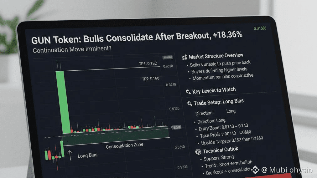 Il $GUN token GUN sta mostrando una forza impressionante dopo un breakout decisivo, guadagnando +18.36% per scambiarsi intorno a 0.01386. Invece di restituire guadagni, l'azione del prezzo è passata in una stretta consolidazione, un segno classico che i tori rimangono in controllo.