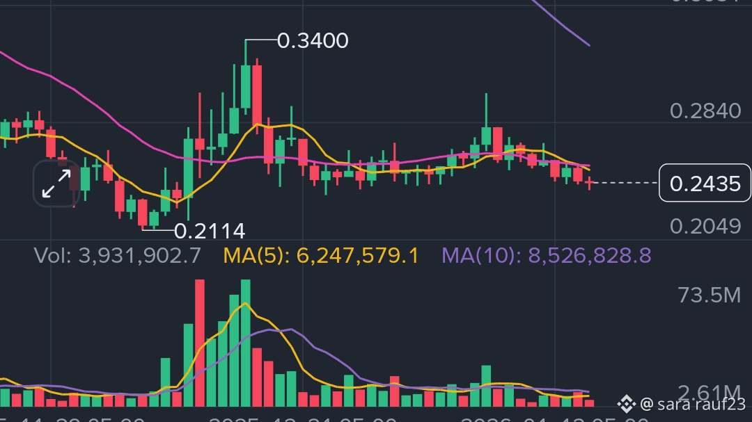 Nella struttura recente, 0.21 USDT era una zona di domanda forte da cui è avvenuto un rimbalzo, ma vicino a 0.34 USDT si è verificata una forte rifiuto. Ciò indica che i compratori al momento non sono ancora in controllo.