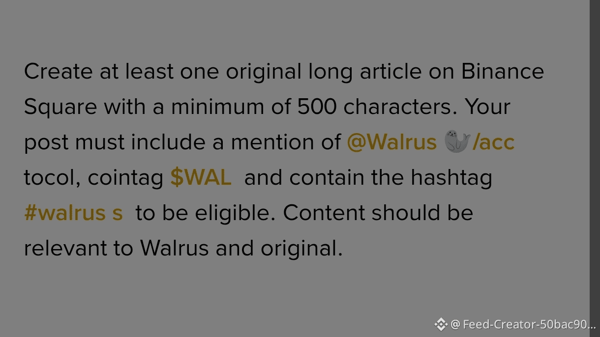 Crea almeno un articolo originale lungo su Binance Square con un minimo di 500 caratteri. Il tuo post deve includere un riferimento a @Walrus 🦭/acc tocol, cointag $WAL e contenere gli hashtag #walrus s per essere idoneo. Il contenuto deve essere pertinente a Walrus e originale.