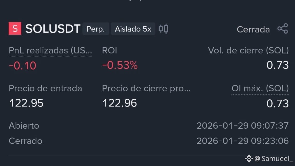¿Il risultato? Non ho lasciato al prezzo di "respirare". C'è stato un piccolo rimbalzo falso che ha toccato il mio SL a 122.96 e mi ha fatto uscire dal gioco. Pochi minuti dopo, ho visto come SOL è andato in picchiata fino a $116.03. La mia analisi era corretta, ma la mia mano tremava.