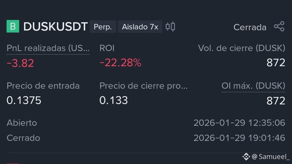 La realtà mi ha colpito forte. Quel verde si è trasformato in un rosso profondo quando DUSK è crollato del -14.59% fino a $0.12010. Ciò che poteva essere una vittoria si è trasformato in una lezione pagata con carattere.