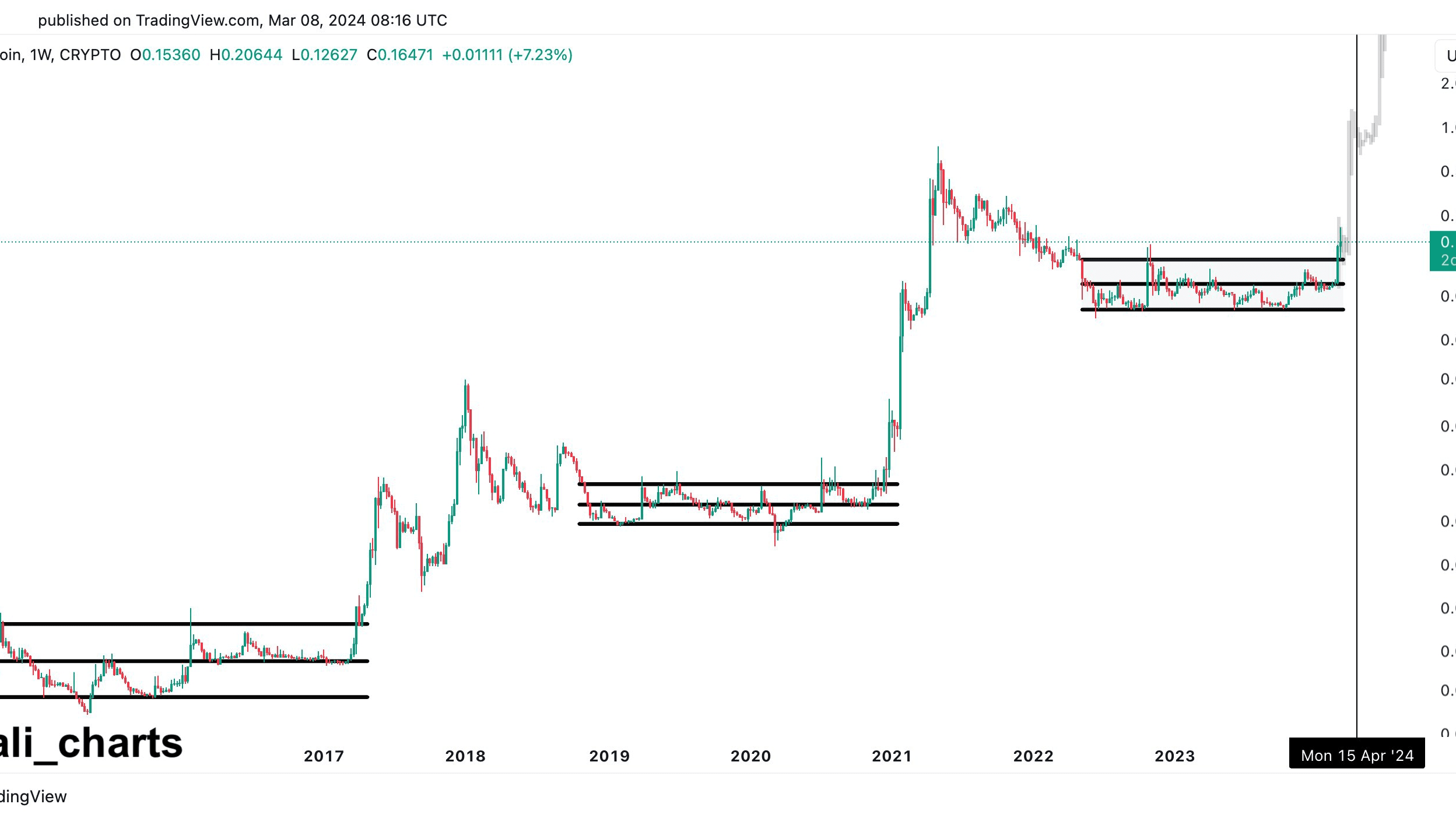 Osservando il grafico del trader, sembra prevedere che DOGE aumenterà rapidamente nel prossimo mese circa dopo aver superato la sua gamma di resistenza, simile a quanto accaduto nel 2017 e nel 2021.