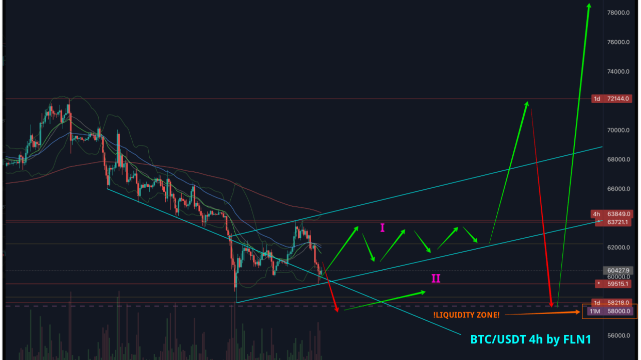 • Zone de lichiditate: Zona dintre $58,000 și $60,000 este o zonă de lichiditate ridicată, unde probabil vor avea loc mișcări semnificative ale prețului.