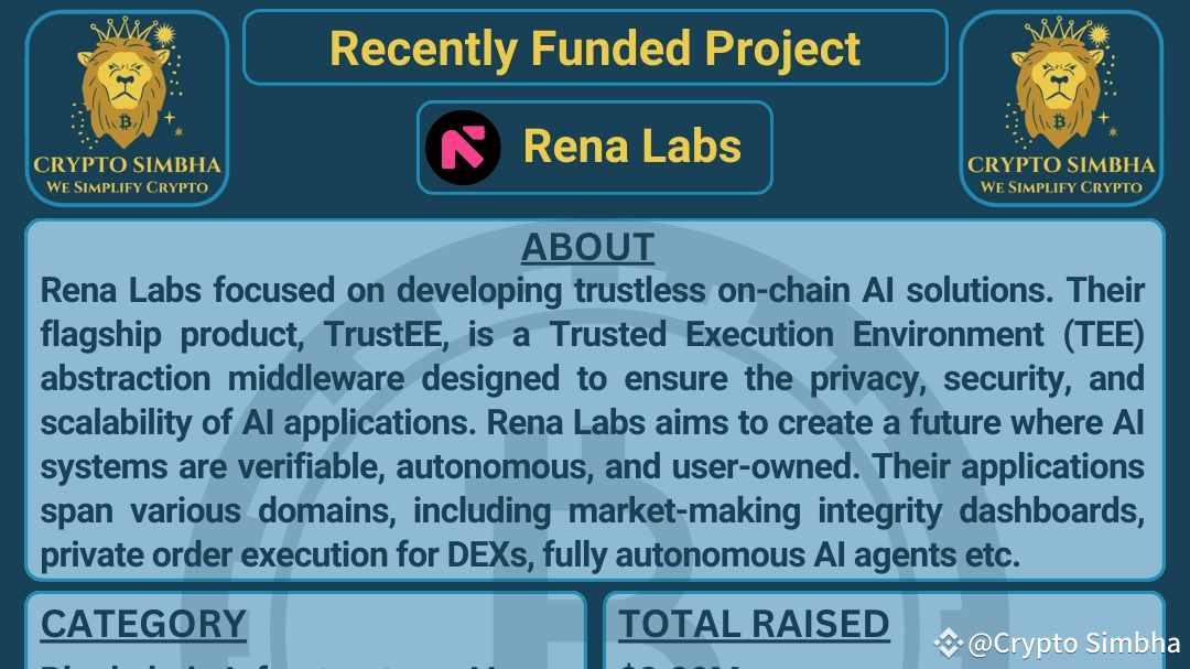 🔹Despre: Rena Labs este o startup de pionierat axată pe dezvoltarea de soluții AI fără încredere pe blockchain. Produsul lor principal, TrustEE, este un middleware de abstractizare a unui Mediu de Execuție de Încredere (TEE) destinat să asigure confidențialitatea, securitatea și scalabilitatea aplicațiilor AI. Rena Labs își propune să creeze un viitor în care sistemele AI sunt verificabile, autonome și deținute de utilizatori. Aplicațiile lor acoperă diverse domenii, inclusiv tablouri de integritate pentru market-making, execuție privată a comenzilor pentru burse descentralizate (DEX-uri), agenți AI complet autonomi pentru jocuri pe blockchain și vânzări de date private în rețele de infrastructură fizică descentralizată (DePIN). Compania este condusă de o echipă de experți din instituții prestigioase precum Princeton și MIT. Misiunea Rena Labs este de a face implementarea AI securizată accesibilă atât dezvoltatorilor, cât și utilizatorilor finali cu doar câteva clicuri. Abordarea lor inovatoare combină AI cu tehnologia blockchain pentru a oferi soluții impactante și scalabile. Această finanțare recentă îi va ajuta să accelereze dezvoltarea și să își extindă echipa.🚀🌐