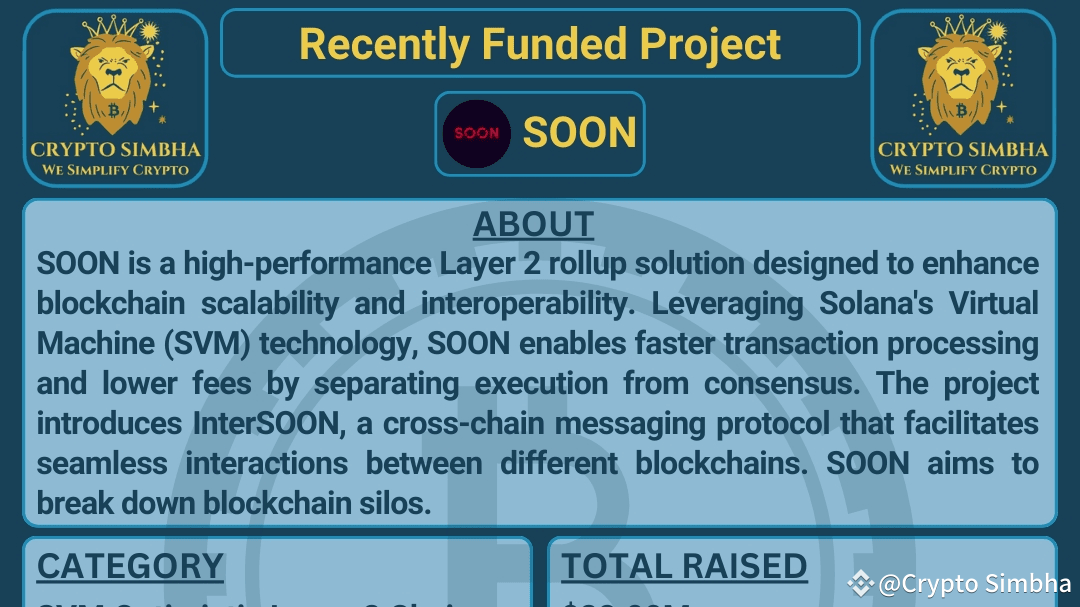 🔹Despre: SOON este o soluție de rollup Layer 2 de înaltă performanță, concepută pentru a îmbunătăți scalabilitatea și interoperabilitatea blockchain-ului. Folosind tehnologia Mașinii Virtuale Solana (SVM), SOON permite procesarea mai rapidă a tranzacțiilor și taxe mai mici prin separarea execuției de consens. Proiectul introduce InterSOON, un protocol de mesagerie cross-chain care facilitează interacțiuni fără întreruperi între diferite blockchain-uri. SOON își propune să rupă silozurile blockchain, făcând aplicațiile multi-chain mai accesibile pentru dezvoltatori și utilizatori. Cu arhitectura sa decuplată, SOON susține aplicații de înaltă capacitate, inclusiv jocuri și DeFi, fără a fi legat de constrângerile Ethereum. Token-ul $SOON susține guvernarea, staking-ul și taxele de tranzacție în cadrul ecosistemului, promovând descentralizarea și implicarea comunității. Abordând provocările cheie în tehnologia blockchain, SOON își propune să atingă adoptarea în masă și să creeze un mediu blockchain mai eficient și interconectat.🚀🌐