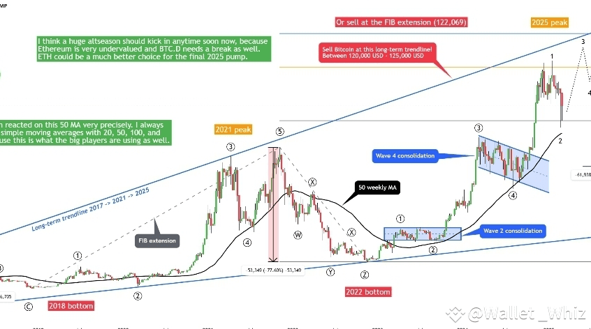 Graficul împărtășit sugerează un scenariu în care Bitcoin este într-o „Val 3” mai mare a unui ciclu care a început la minimurile pieței bear (~15.5k la sfârșitul anului 2022). Conform teoriei clasice a valurilor Elliott, Val 3 este adesea cea mai lungă și mai impulsivă.
