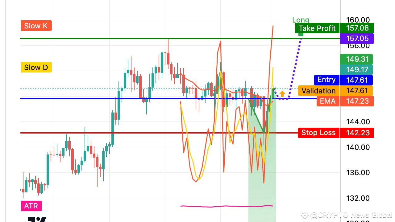 Decizia de tranzacționare: CUMPĂRAȚI Pe graficul de 4 ore, prețul arată un rebound puternic recent dintr-o zonă de suport aproape de 142.23, cu un EMA (9) în jurul valorii de 147 acționând ca suport dinamic, iar oscilatorul stochastic trecând de la supravândut la supracumpărat, semnalizând un moment de creștere. Acțiunea prețului din mijlocul lunii aprilie până la începutul lunii mai formează o structură potențială de tip dublu fund cu o linie de gât aproape de 147.6, confirmată printr-o ieșire și retestare la acest nivel. Pe graficul săptămânal, tendința este ascendentă, dar se consolidează după o retragere, cu EMA susținând prețul deasupra valorii de 140 și stochasticul recuperându-se din zona de supravândut. Această aliniere pe mai multe intervale de timp susține un bias de creștere cu intrare aproape de confirmarea ieșirii, stop loss sub minimul recent, și take profit aproape de maximele săptămânale anterioare în jurul valorii de 157.