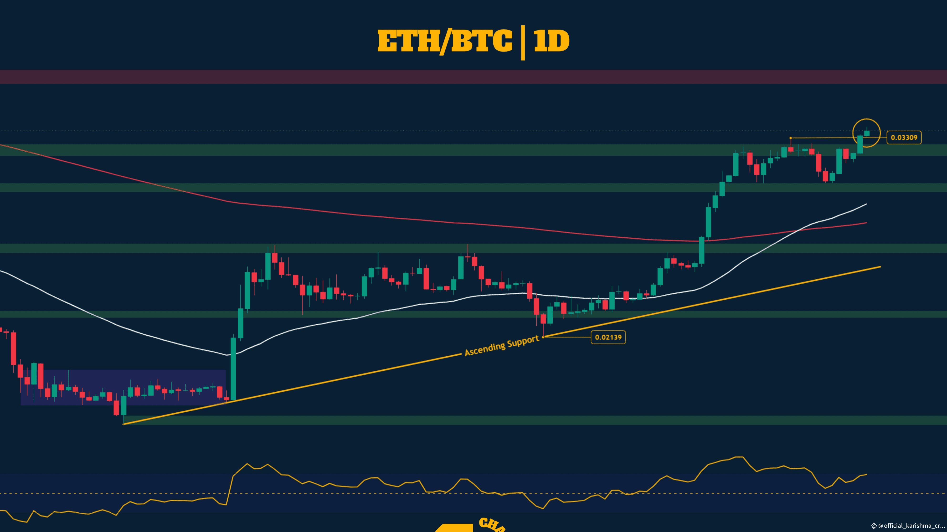 Atâta timp cât ne menținem deasupra B0.03309, nu există o rezistență notabilă până la zona orizontală centrată la $0.03786. Având în vedere că tendința descendentă din graficul de dominanță $BTC este încă în curs, aceasta rămâne o configurație pozitivă pentru #ETH și piața mai largă a altcoin-urilor.