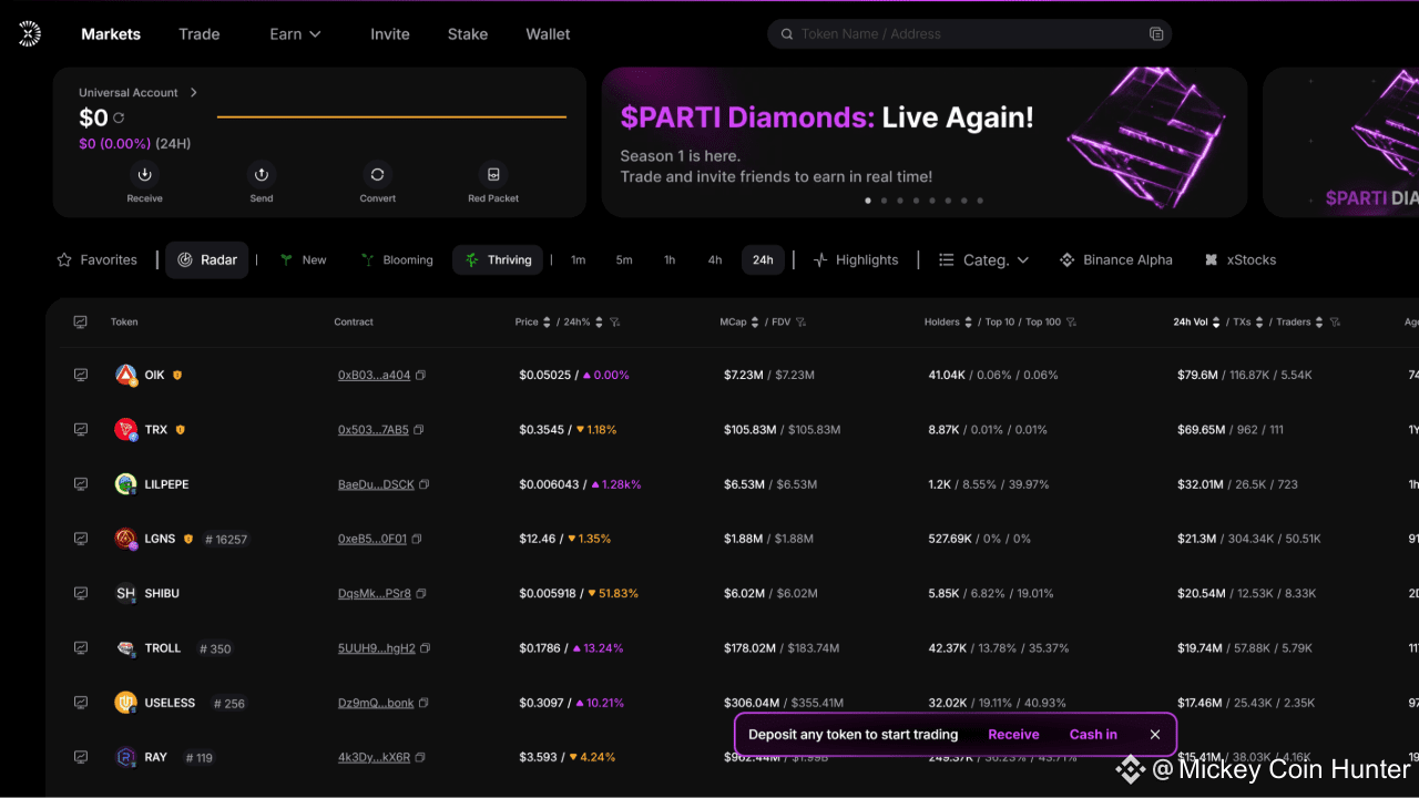Cele mai multe tranzacții câștigătoare pe piața spot încep cu un lider credibil. Suprafața Home a UniversalX curăță listele Radar (noi, înfloritoare, prosperând pe interval de timp), Highlights (câștigători/pierderi, trending, recent listate) și categorii pe sector/nise. Din orice listă, un singur clic deschide interfața Trade cu instrumente de diligență și execuție gata.
