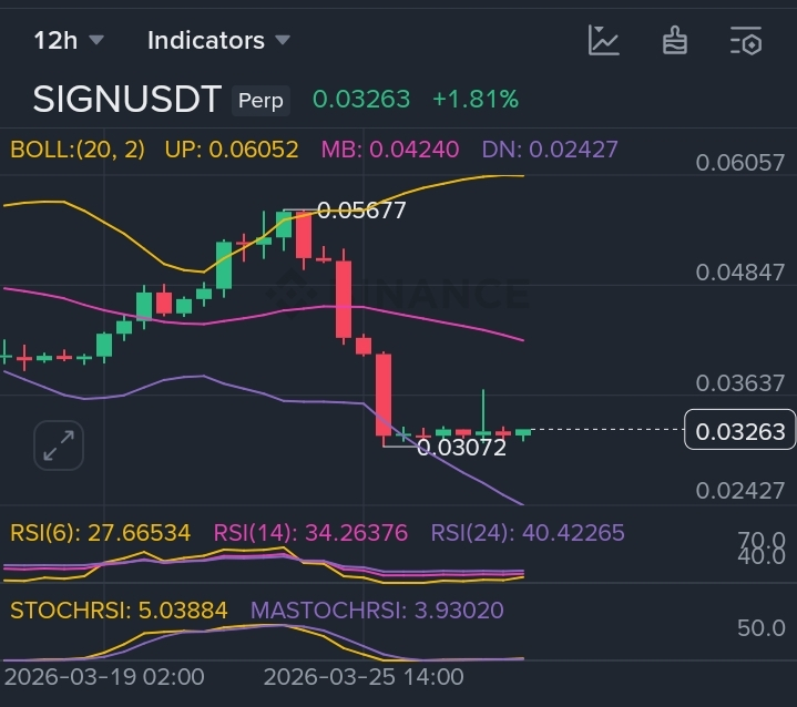 I'm telling you, man... cine spune ca piata e linistita nu se uita la graficul de 12 ore. Dupa prabusirea verticala de la 0.056, benzile Bollinger pe $SIGN au explodat in exterior. Asta inseamna o singura chestie: suntem intr-o zona de volatilitate extrema unde emotiile sunt la cote maxime. 🛡️🐢