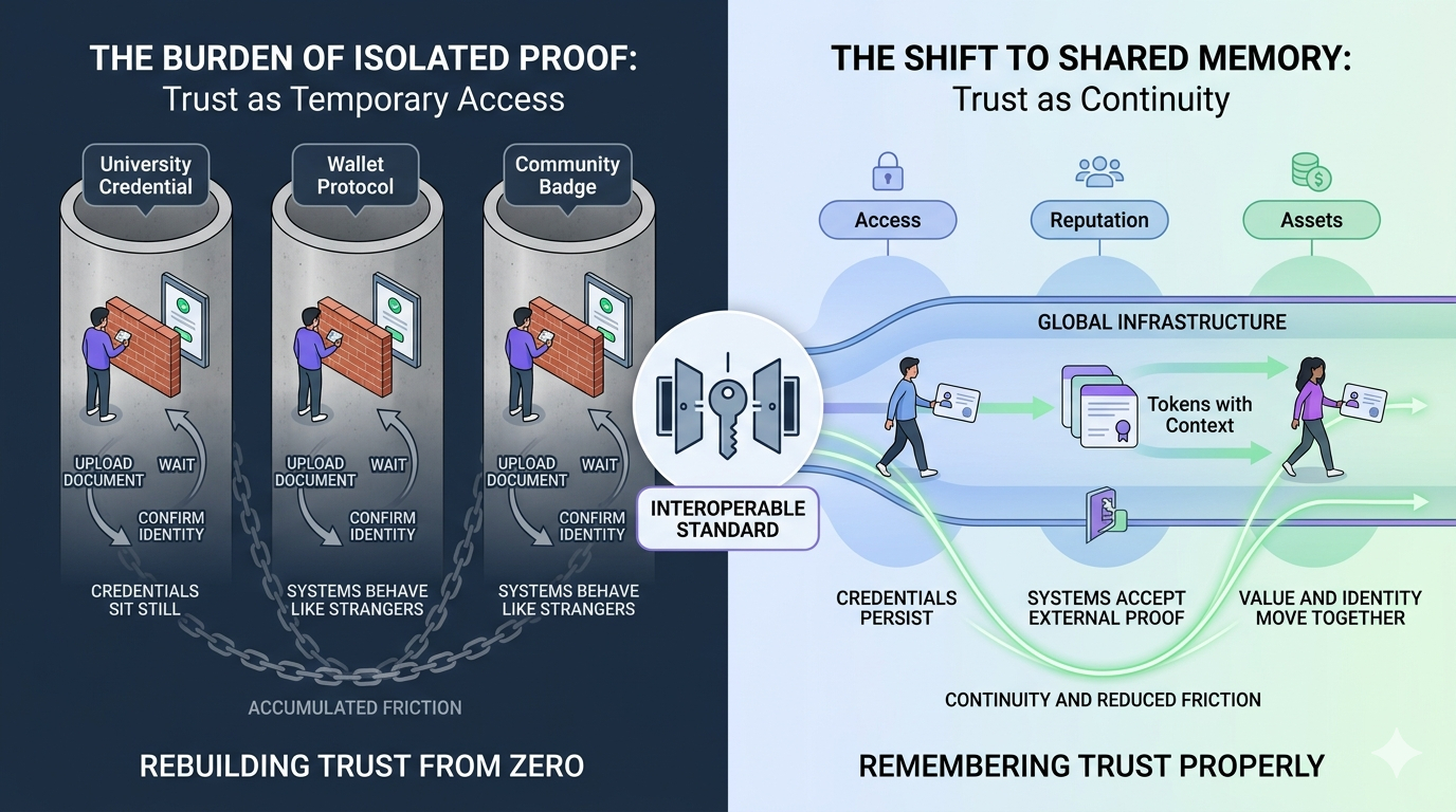 It starts small. A wallet reconnect. A document upload. A badge that only works where it was issued. Nothing dramatic, just repetition wearing different clothes. Every platform asking the same question in a slightly different tone. Who are you. Prove it again. Sign again. Wait again. Systems behaving like strangers even after meeting you yesterday.