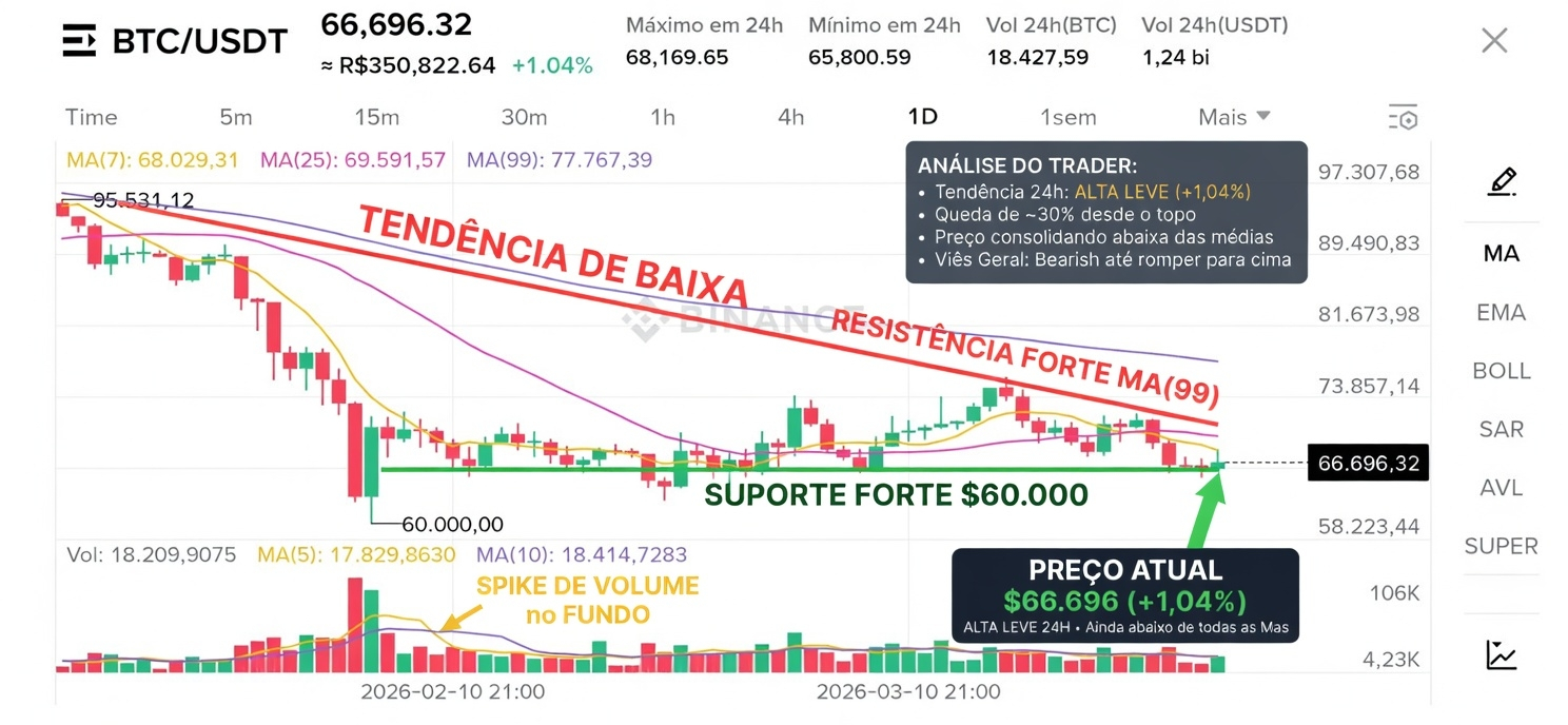 Preço subiu de 65.800 pra 66.696 (+1,04% nas últimas 24h), mas continua bem abaixo de TODAS as médias móveis (MA7 68.029, MA25 69.591 e MA99 77.767).