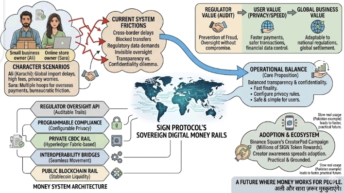 Ali’s story isn’t unique. Millions face this same dilemma across Pakistan and the world. Governments need oversight to prevent fraud. Citizens want privacy and convenience. Current systems either focus on speed but ignore privacy. Or they protect privacy but make audits impossible. There’s this constant tension between transparency and confidentiality. For example, Sara, another friend who runs an online store, recently tried to pay a supplier overseas. She had to jump through multiple hoops just to confirm the transaction. She lost hours to bureaucratic delays. It’s simple friction, but it adds up. Sign Protocol addresses this problem. I found it fascinating because it doesn’t aim to be just another cryptocurrency. It’s designed to give countries a digital money system that works for both citizens and regulators. There’s a public blockchain which is transparent and ideal for corporate transactions or cross-border payments. Then there’s a private, permissioned blockchain perfect for sensitive operations like central bank digital currencies. On this private rail, personal transactions stay confidential. Yet regulators can access them if needed. Ali’s cross-border transfer problem could be solved in minutes. Sara’s privacy concerns would be respected. What really impressed me is how the two rails work together. Bridges let people move funds between the private CBDC system and public stablecoins seamlessly. Imagine Ali sending money internationally. It starts in a private CBDC channel. Then it converts into a stablecoin for cross-border settlement and reaches the recipient instantly without compromising personal data. It’s like invisible plumbing behind the scenes. Smooth, yet secure. Because it’s programmable, the system can adapt to different countries’ regulations. That’s huge for global businesses. The architecture itself is clever. The private blockchain uses Hyperledger Fabric-based technology allowing configurable privacy, fast finality and strong governance. High-volume transactions remain private but are auditable by authorities. This shows that privacy doesn’t conflict with operational scale. I kept thinking about Ali. He wouldn’t need to spend hours in bank queues or on calls anymore. In my view, the beauty lies in its simplicity for users. Citizens see faster payments, safer transactions and more control over their financial data. At the same time, regulators get what they need. Visibility and audit trails are available without compromising privacy. It feels practical, grounded and ready for real-world use. I also learned that the Sign Protocol ecosystem is starting to engage communities. Binance Square’s CreatorPad recently launched a campaign offering millions of SIGN tokens as rewards for creators. Ali or Sara could use these platforms to learn more about digital finance. They could also get incentives for early participation. It’s technology that feels approachable, not just theoretical. Thinking ahead, systems like Sign Protocol could change how nations think about money. Daily transactions would be smoother. Adoption would grow faster. Trust in digital financial systems could rise. As more creators engage with Binance Square campaigns, awareness spreads and adoption grows naturally. This could be the moment digital money starts feeling human, practical and secure. So next time you’re frustrated by banking delays or online payment hassles, remember this. There’s a system being built that respects privacy, satisfies regulatory needs and moves money faster than ever. I’m sharing this because it’s not just technical achievement. It’s a glimpse into a future where money works for people, not the other way around. Ali and Sara would certainly smile if they knew such solutions are coming.