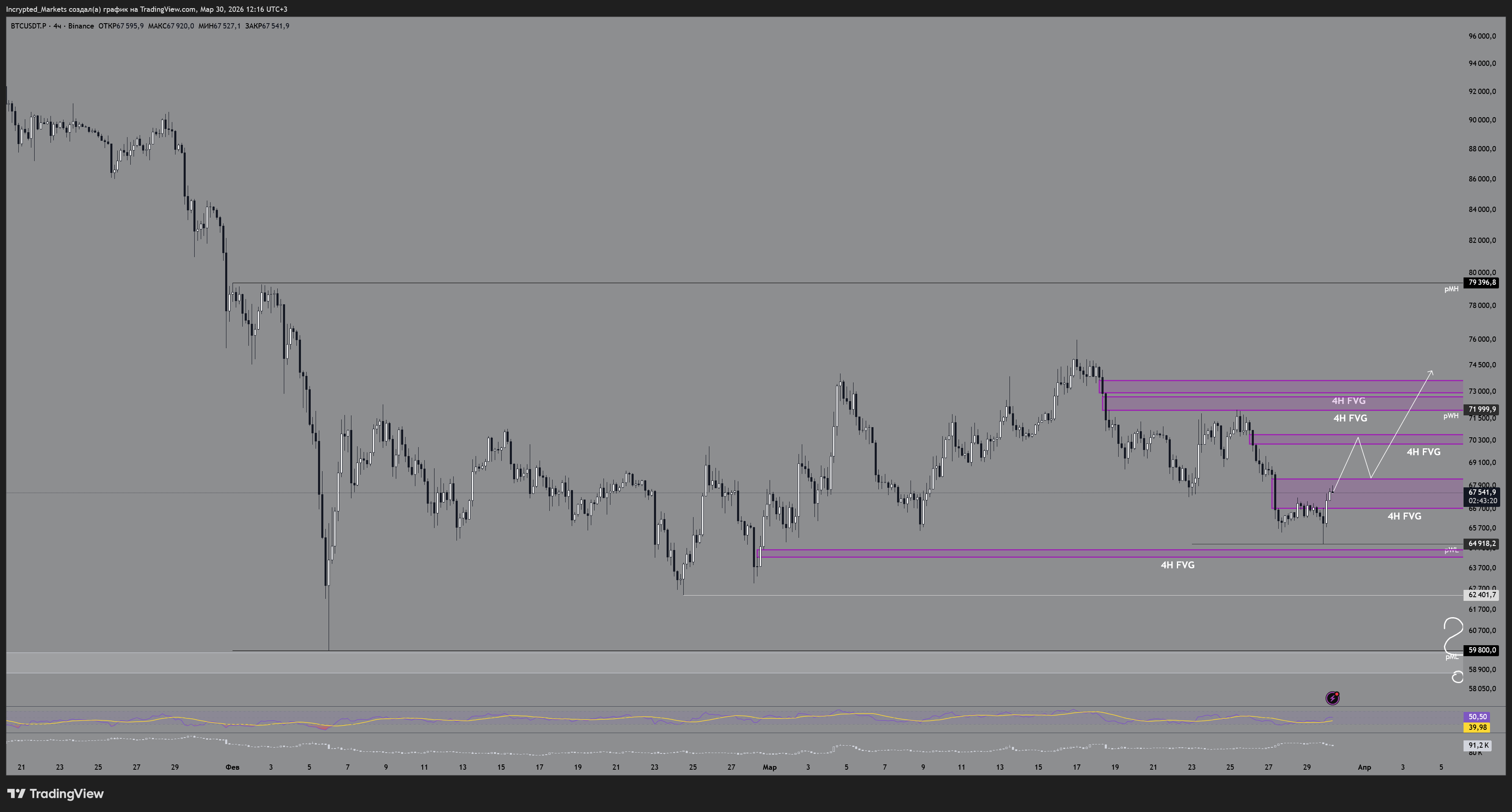 Логіка: зверху через останні новинні виноси та ліквідаційні сквізи накопичився солідний пул ліквідності. Графік намалював «полицю» аж до $70 000. Локальний відскок на початку тижня (понеділок-вівторок) виглядає максимально природно — як мінімум для збору цієї ліквідності, як максимум — для класичної маніпуляції перед закриттям місяця.