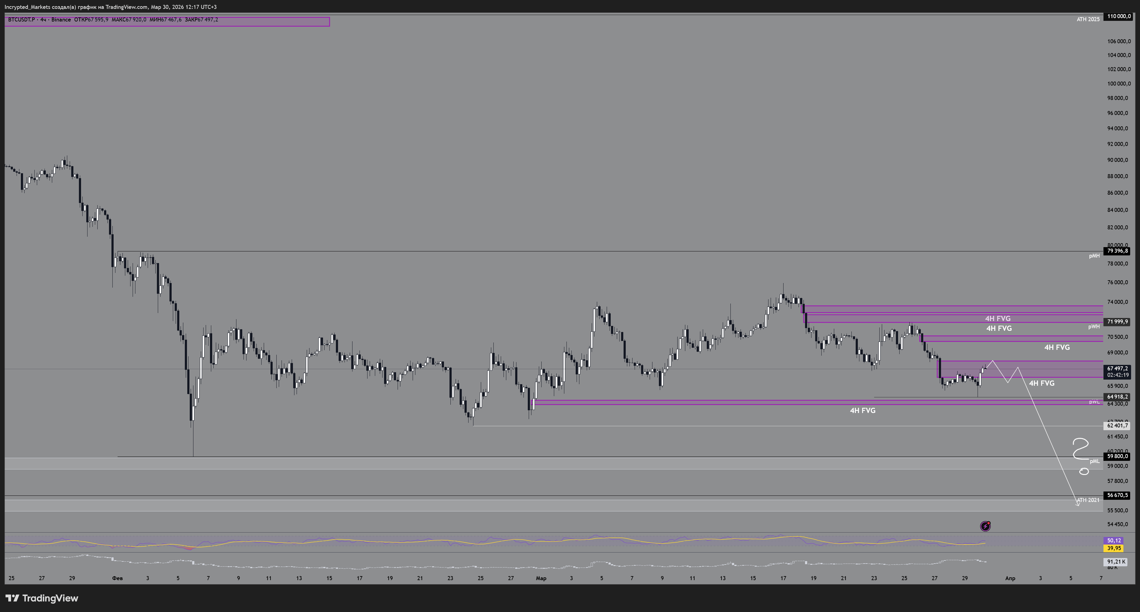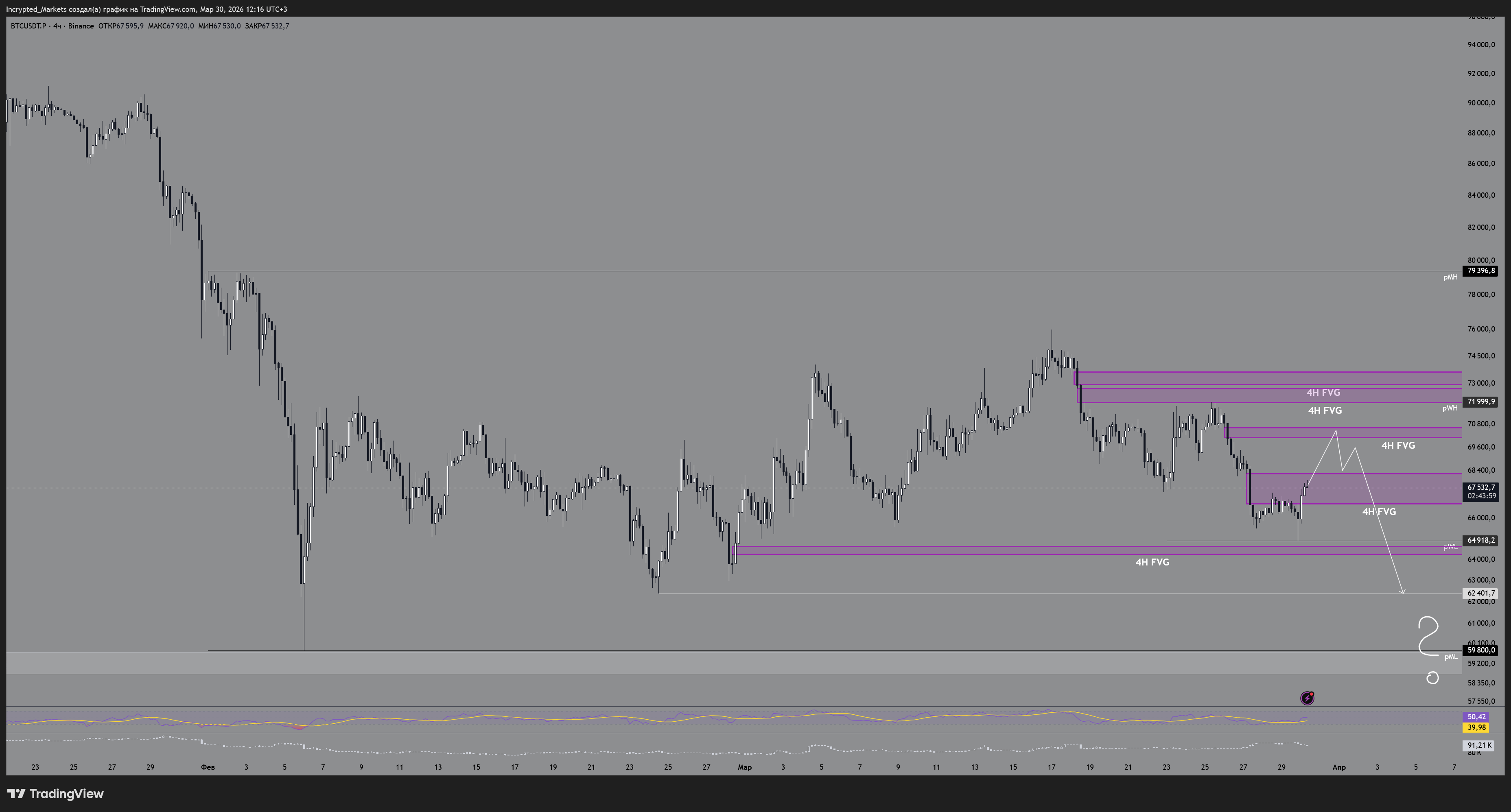 Логіка: легкий свіп вгору в понеділок, збір локальних стопів, а потім відкат для зняття мінімумів попереднього місяця. Схоже на сценарій А, але без глибокого походу за ліквідністю на $70k — обмежимося повним перекриттям 4H FVG. Ключовий рубіж — тест зони $64 000–$62 000 і здатність покупців там встояти.