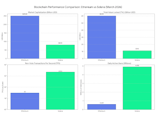 The provided data visualization captures four critical performance and adoption indicators that define the trade-offs between the two networks.