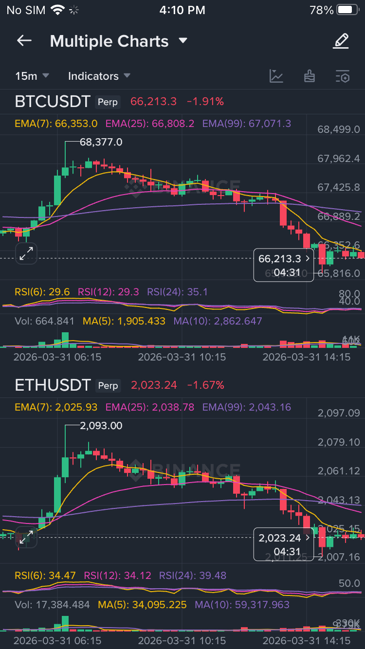 The market is currently bleeding due to a "perfect storm" of geopolitical tension and oil price spikes. However, technical indicators on the 15-minute timeframe show that Bitcoin (BTC) and Ethereum (ETH) are entering deep "Oversold" territory, creating a high-probability scalping window.