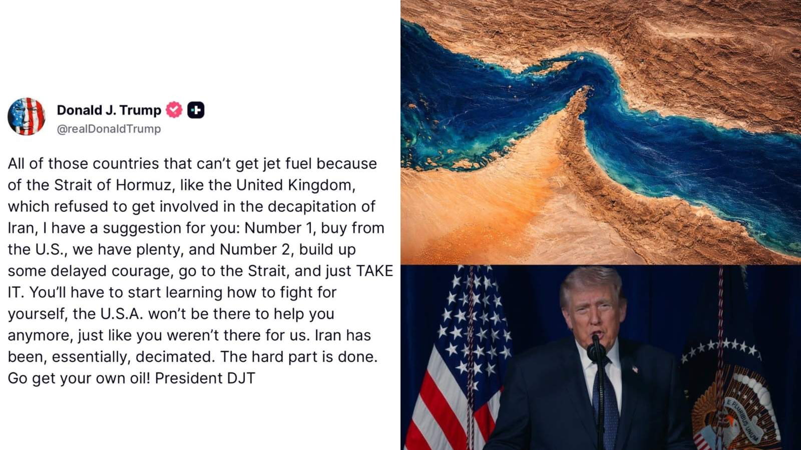 Donald Trump a emis o declarație puternică privind criza actuală a petrolului, îndemnând țările afectate de lipsa de combustibil pentru avioane din cauza perturbării Strâmtorii Ormuz să ia măsuri independente.