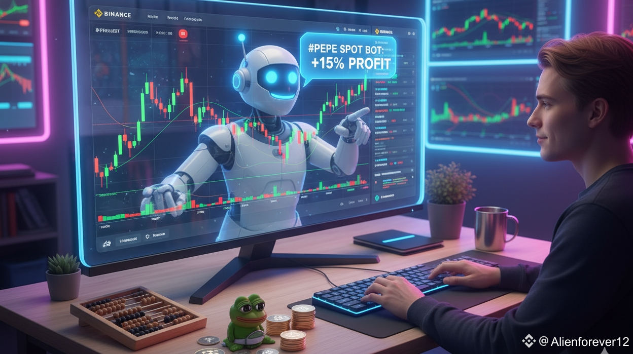 Exemplu pe PEPE: Meme-coins, cum ar fi #PEPE, au adesea perioade de mișcare laterală între raliuri impulsive. Imaginează-ți că #PEPE oscilează între $0.0000050 și $0.0000080. Botul va cumpăra constant la $0.0000050, va vinde la $0.0000060, va cumpăra din nou etc., crescând în fiecare dată cantitatea ta de activ și realizând un mic profit în USDT.
