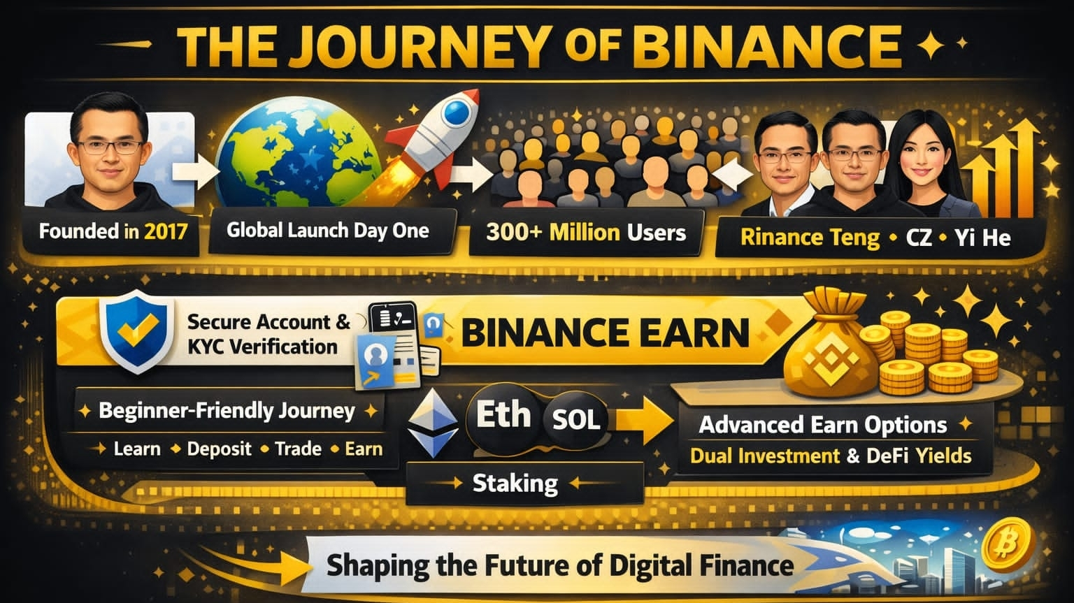 Acest articol explică totul într-un singur loc: parcursul Binance, utilizatorii săi, persoanele importante din spatele său, cum își verifică utilizatorii conturile și cum câștigă oamenii prin Binance Earn, CreatorPad și Write2Earn.