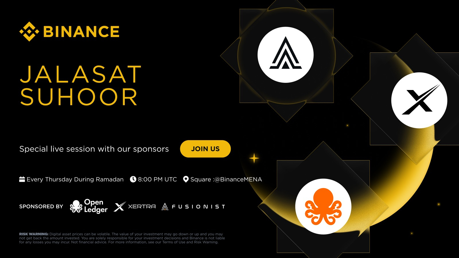 Taking place every Thursday during Ramadan, Jalsat Suhoor is designed to bring our global community together for meaningful conversations, educational insights, and interactive engagement with leading crypto projects and Binance products.