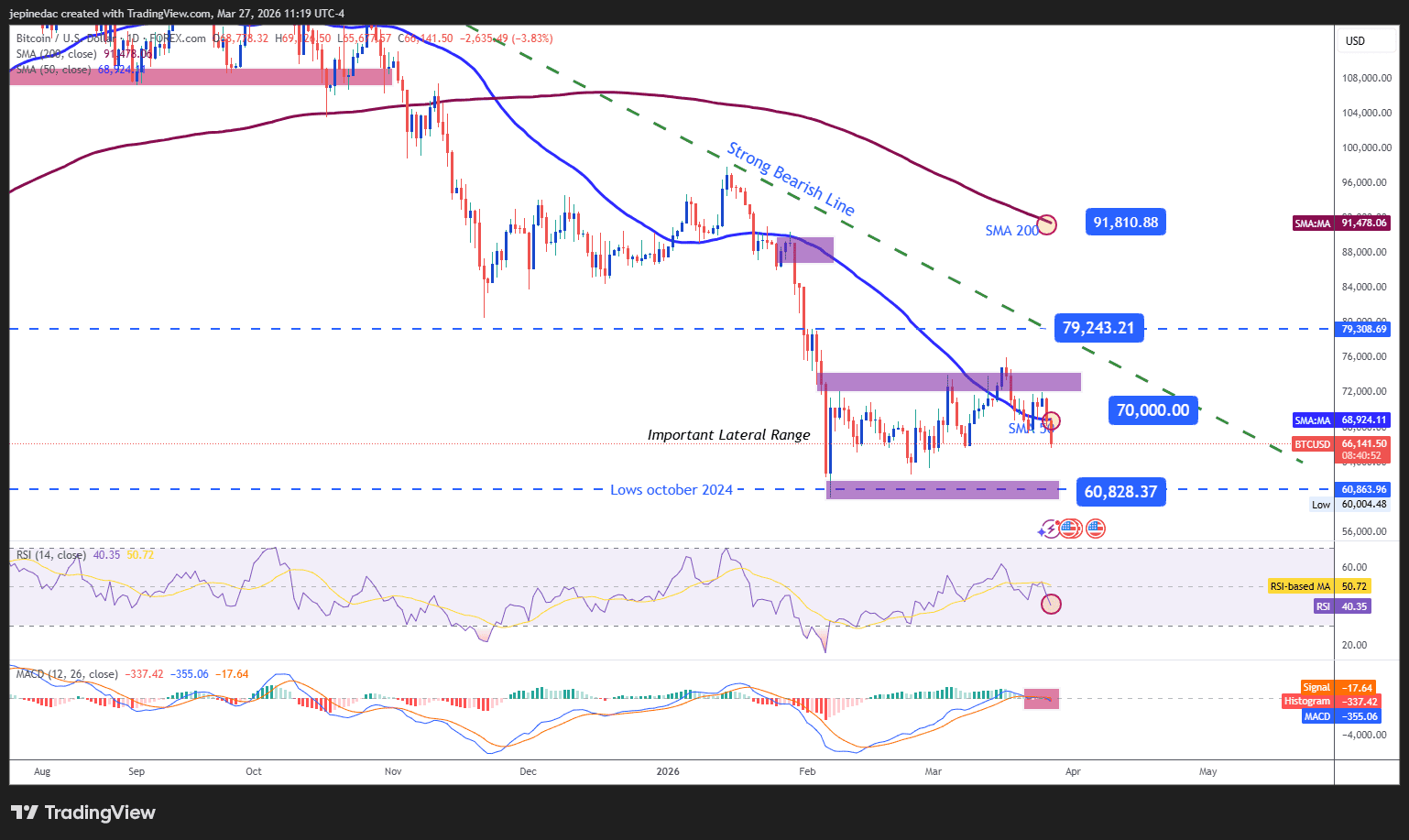 👉The overall trend since late 2025 has been **bearish**, with Bitcoin failing to sustain breaks above key resistance levels like $72,600–$75,000.