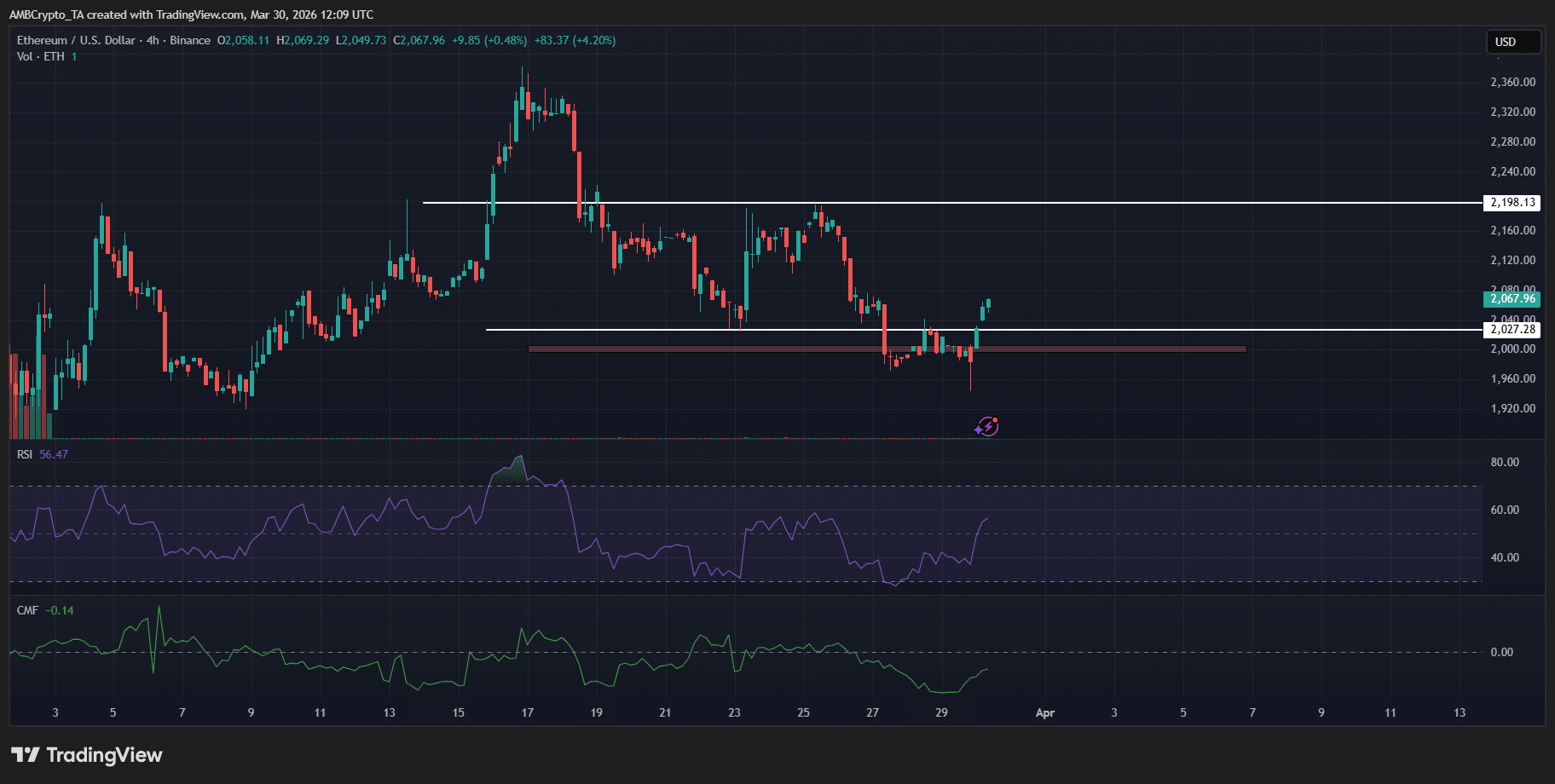 以太坊目前处于关键节点,市场正在检验复苏势头是否能持续。价格从1800美元趋势线反弹至2050美元上方,显示买家在关键区域积极介入,市场结构得到支撑。