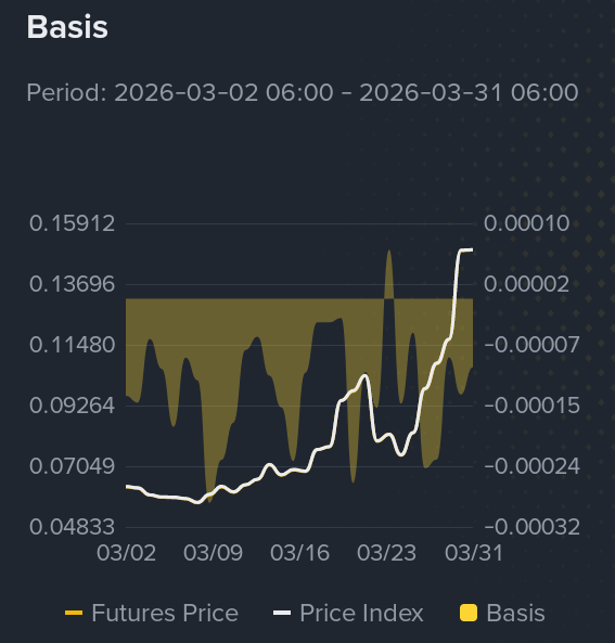 Now the basis is also pushing up, which shows growing bullish sentiment. Traders are willing to pay a premium, expecting higher prices. That’s a strong signal, but also something to be careful with when it gets too crowded.