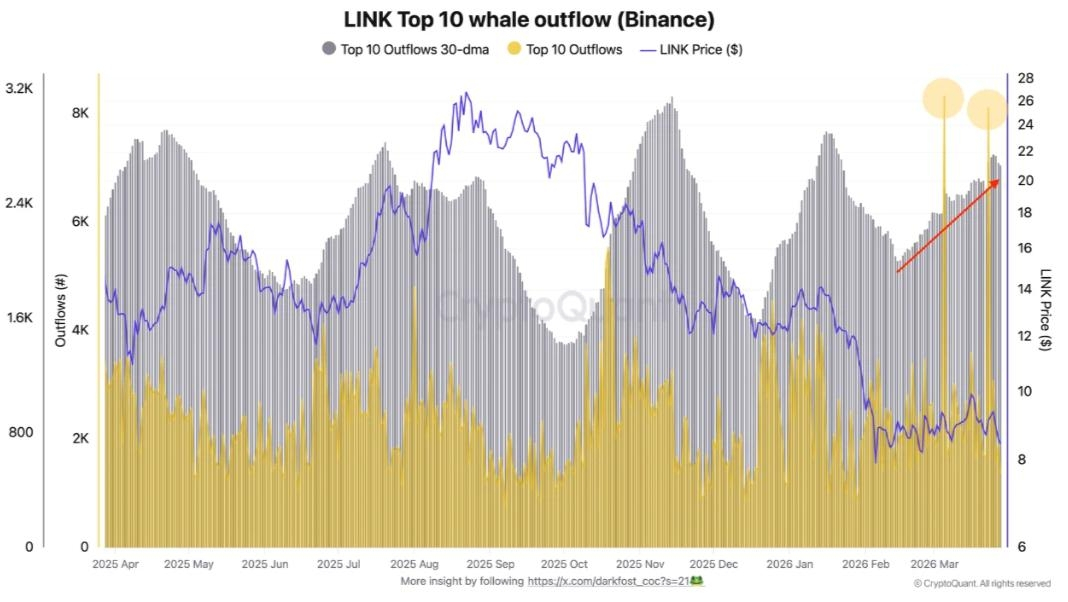 Data highlights two major daily spikes, with over 8,000 LINK withdrawn from Binance among the top 10 transactions of the day.