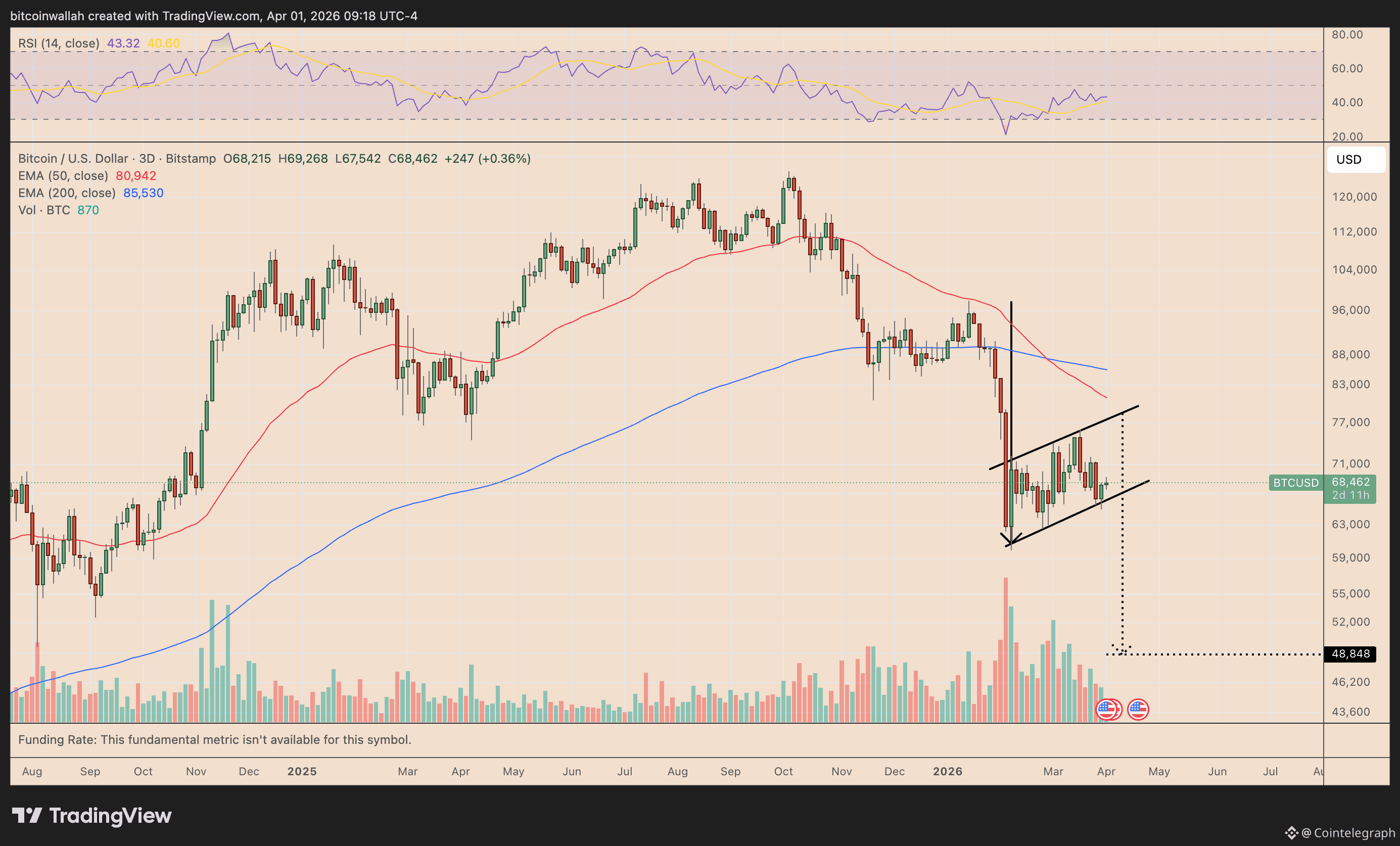 The $80,000 upside target also aligns with the 50-period exponential moving average on the three-day chart, making the area a key near-term resistance zone.
