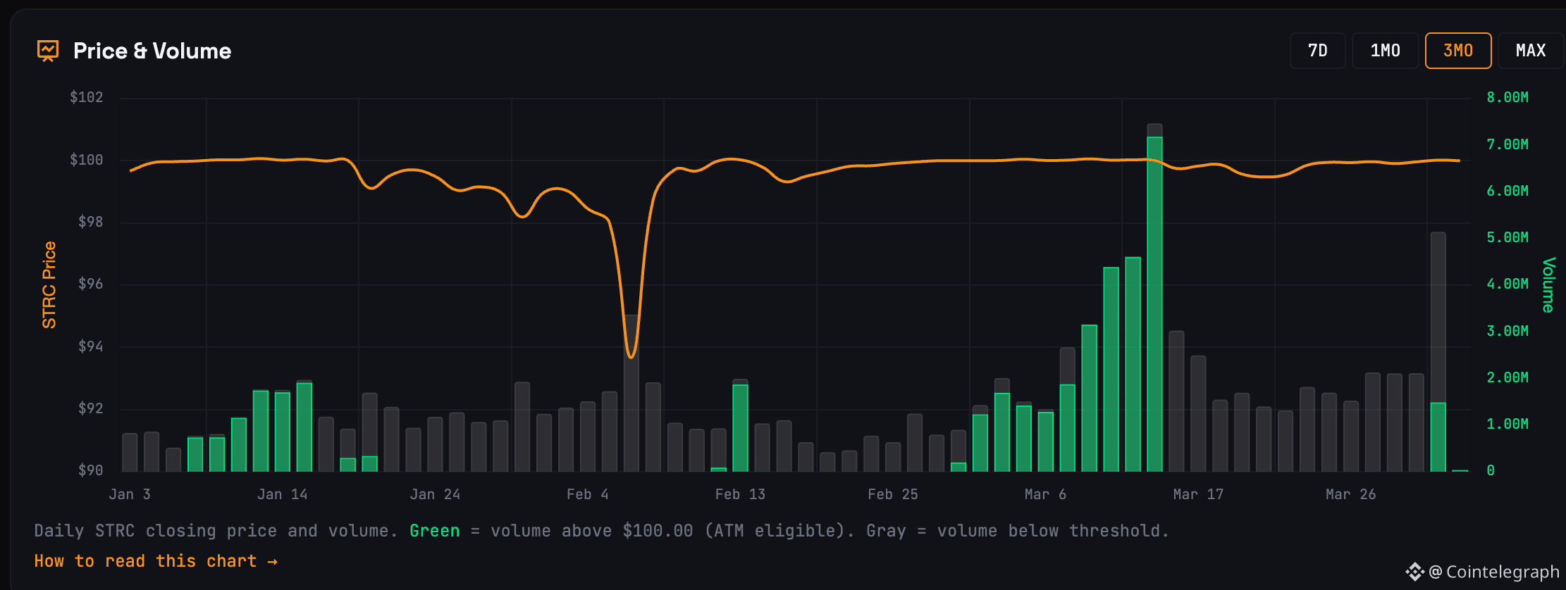 On Tuesday, STRC closed at $100.02, just above its $100 par value. Trading at or above par gives Strategy room to issue new shares, raise fresh capital and deploy the proceeds into Bitcoin.