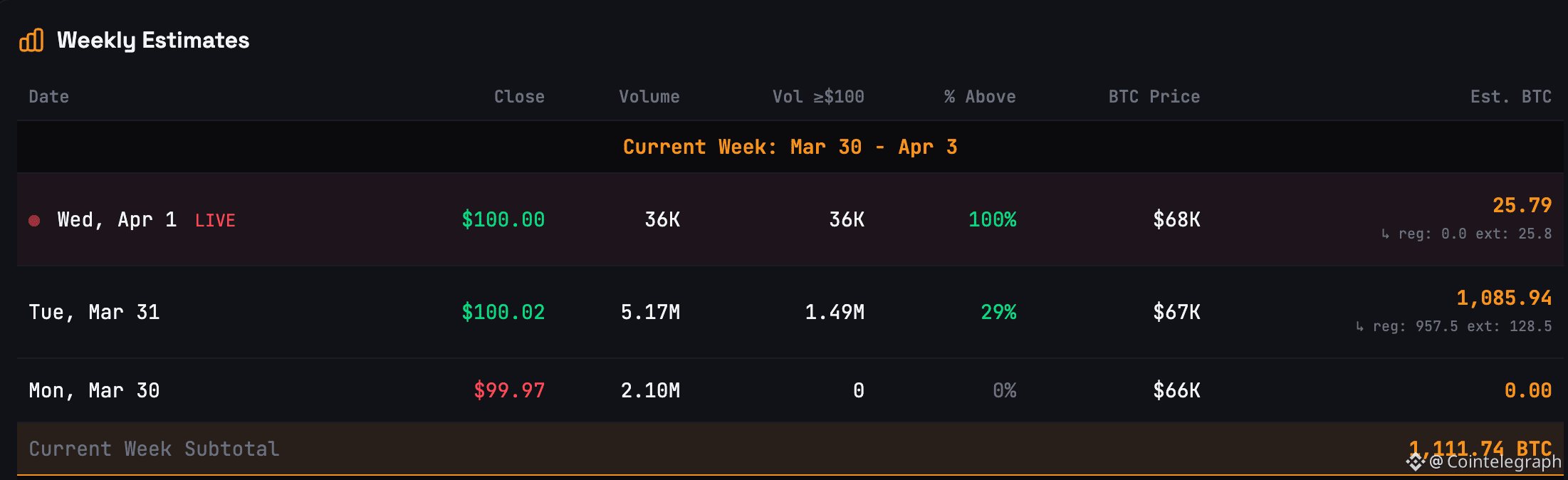Estimates from STRC.LIVE suggest Strategy had raised enough by Tuesday’s close to fund the purchase of more than 1,085 BTC, with the weekly total rising to over 1,111 BTC. That is equivalent to around $76.25 million.